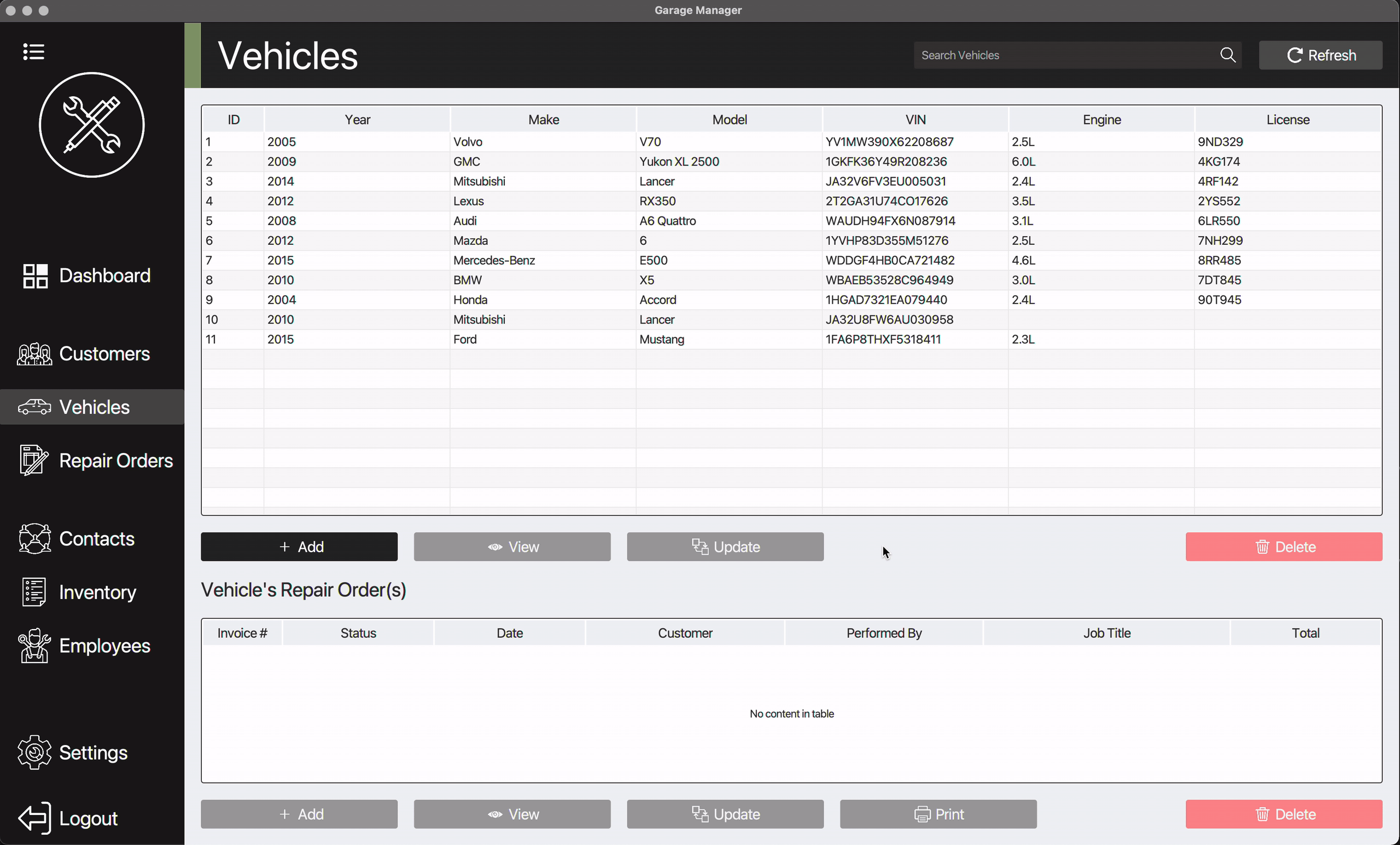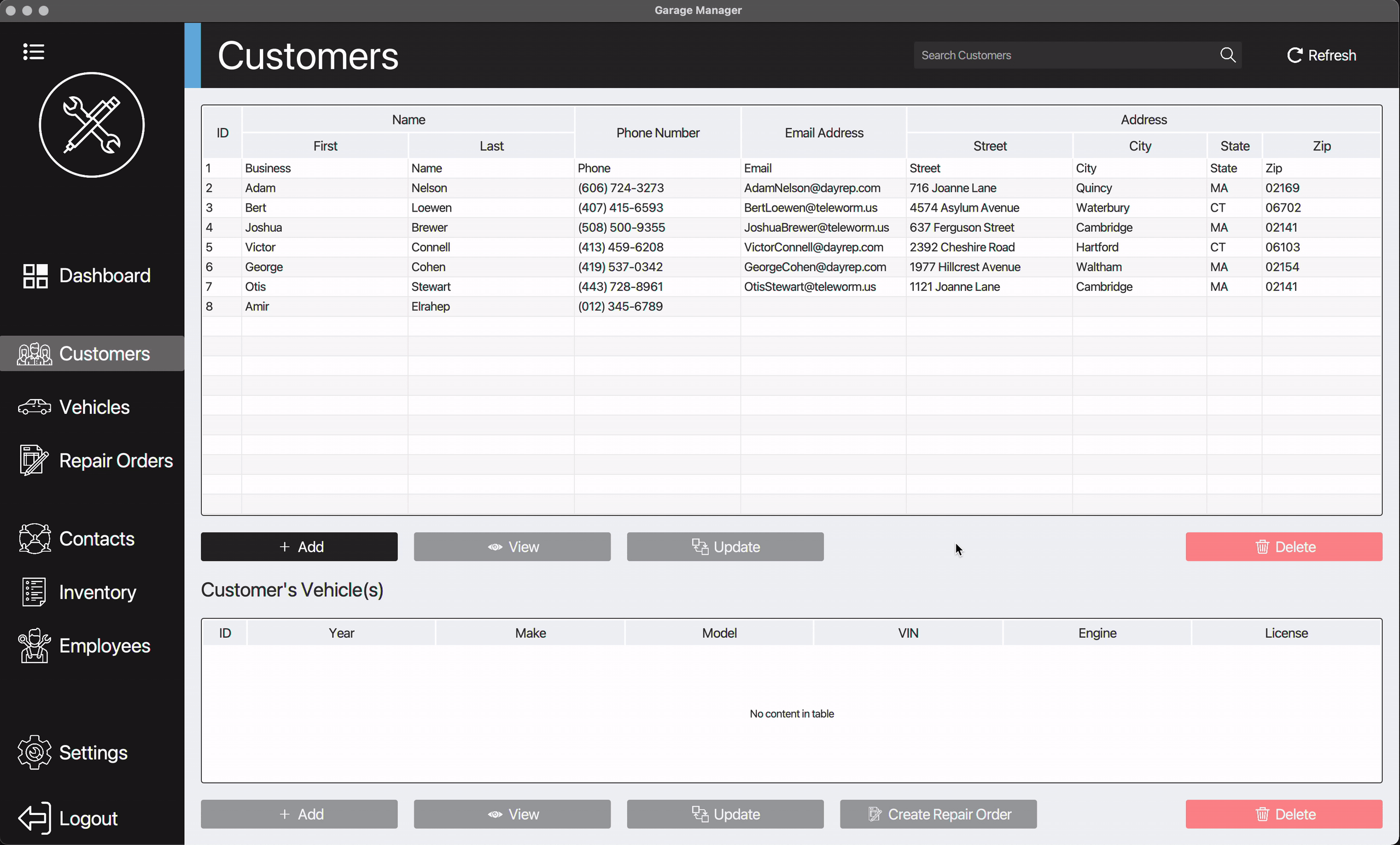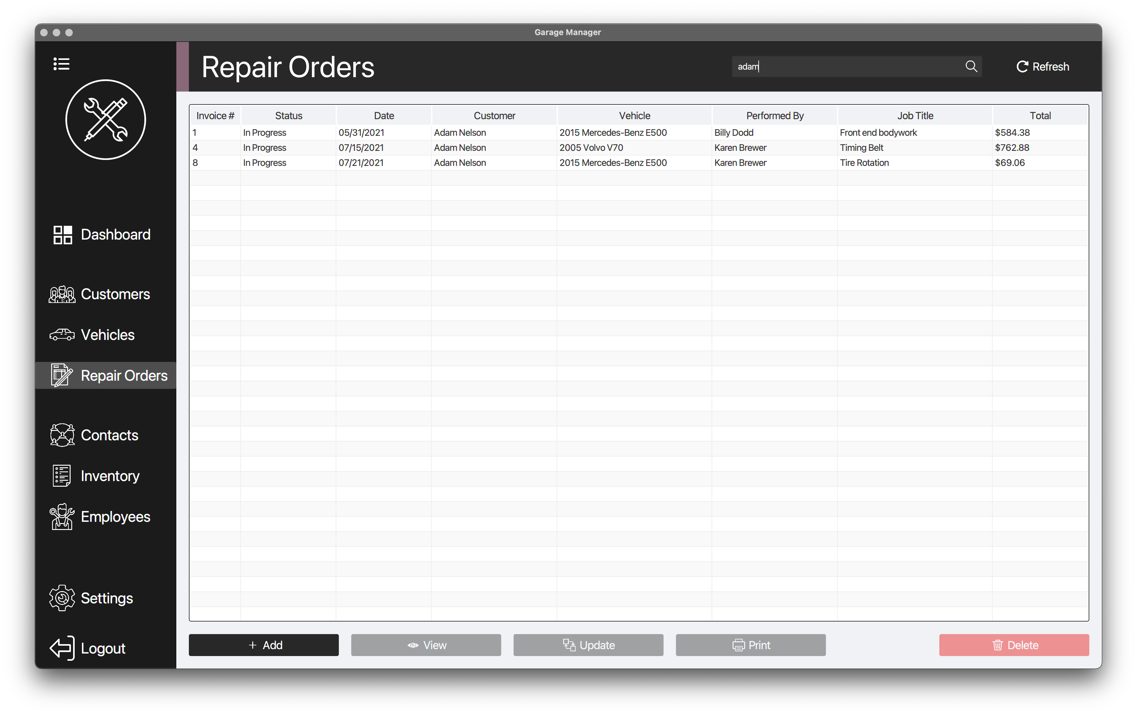 Easily add, view, update, and delete records such as customer, vehicle, repair order, contact, inventory, and employee.