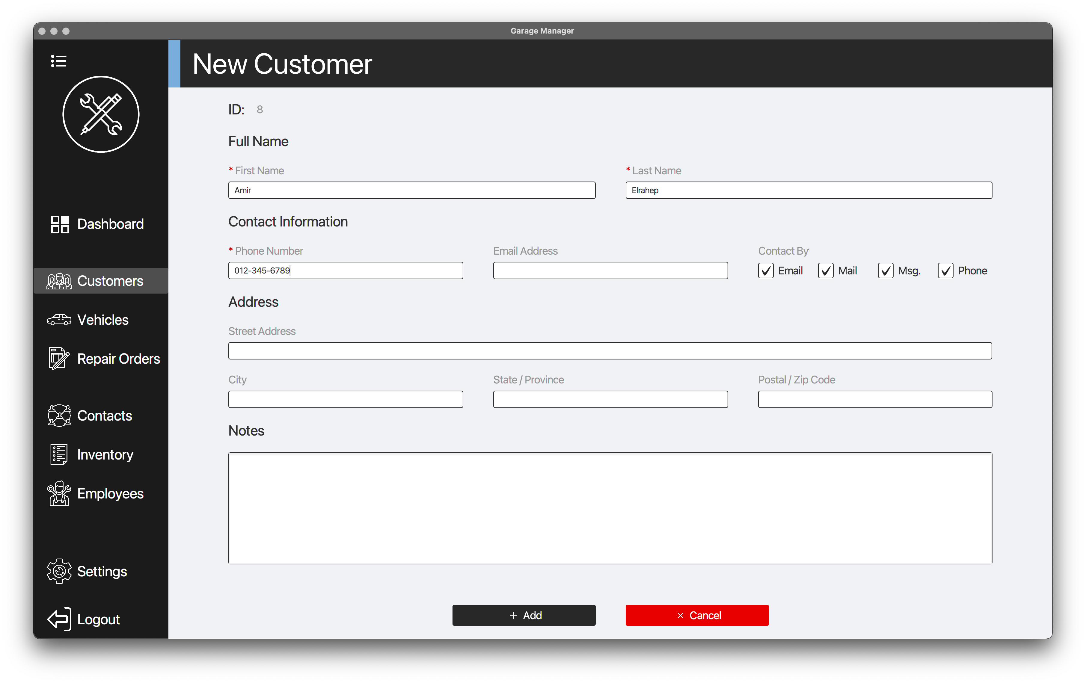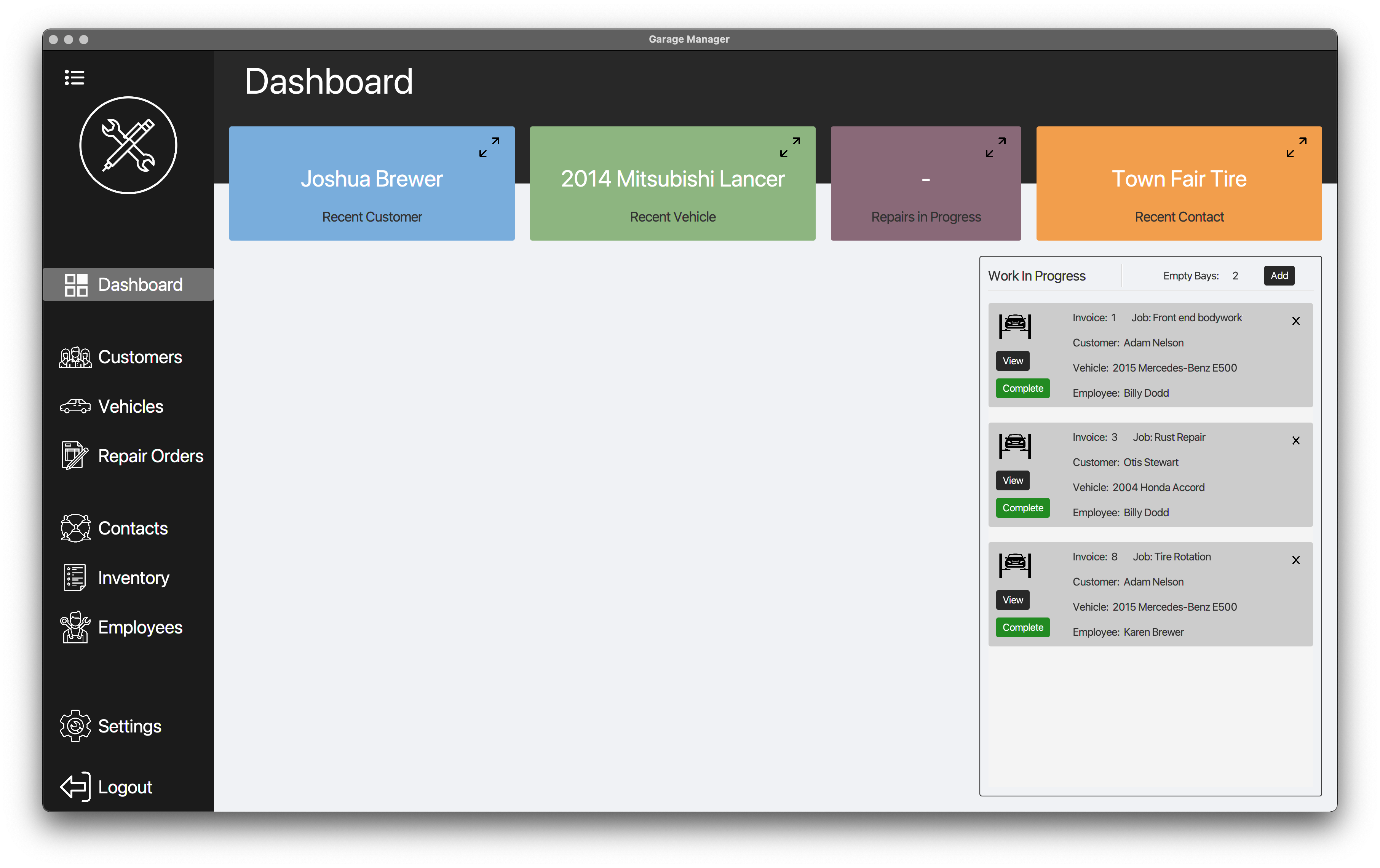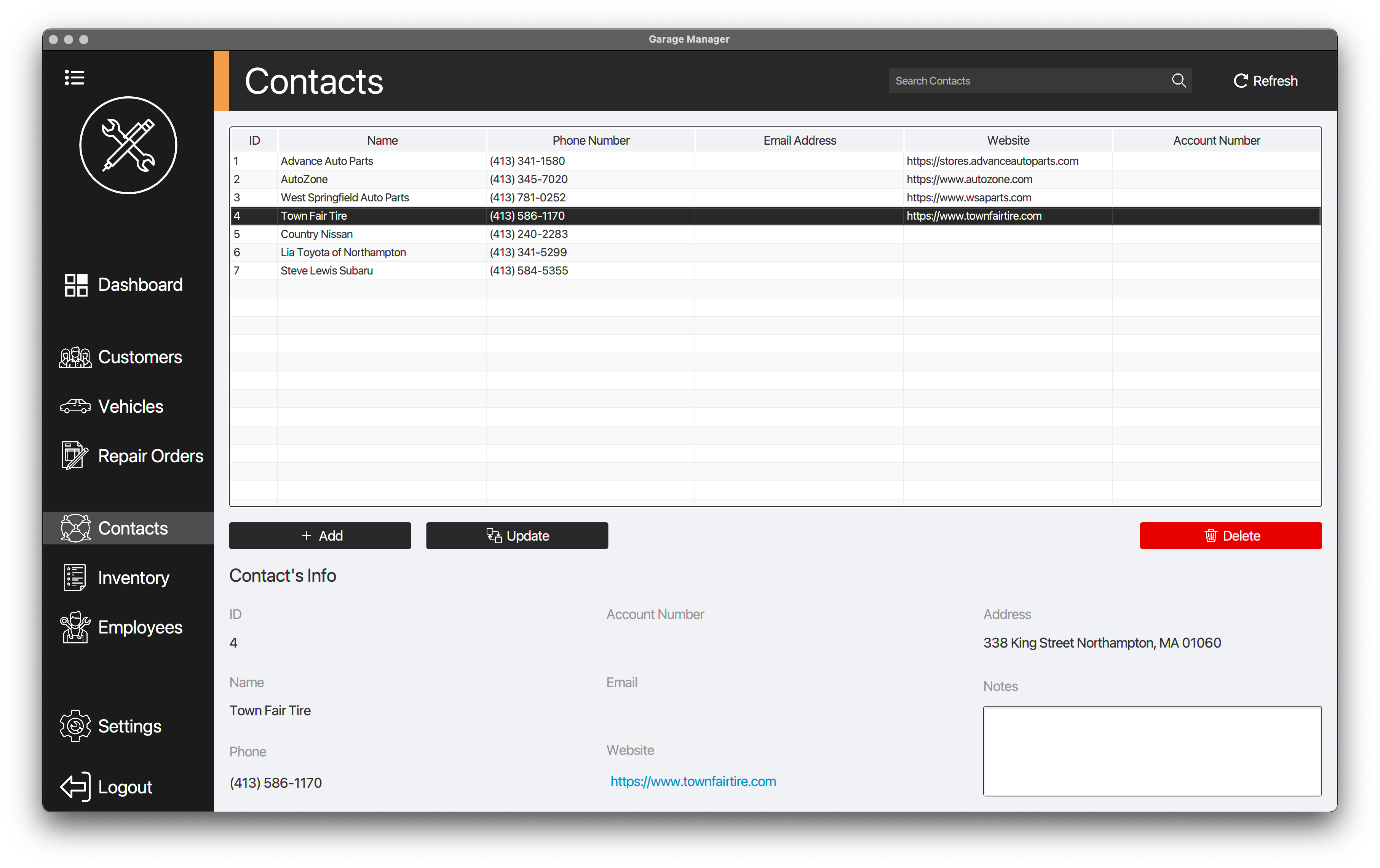 Easily add, view, update, and delete records such as customer, vehicle, repair order, contact, inventory, and employee.