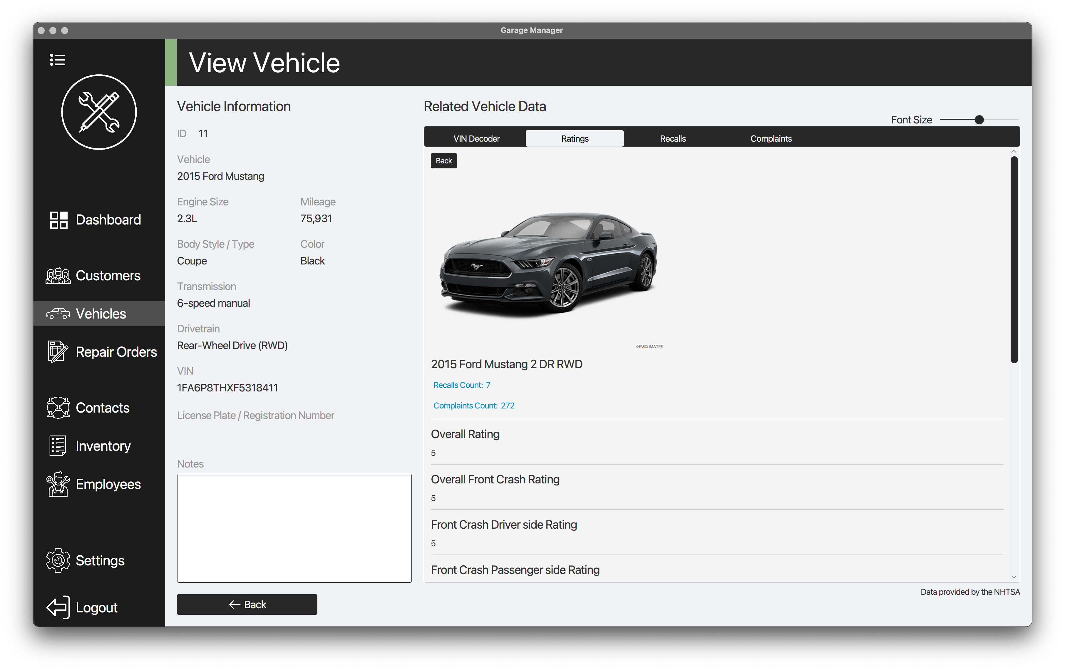 Easily view more information about a vehicle from the built-in VIN Decoder, ratings, recalls, and complaints section from the NHTSA API.